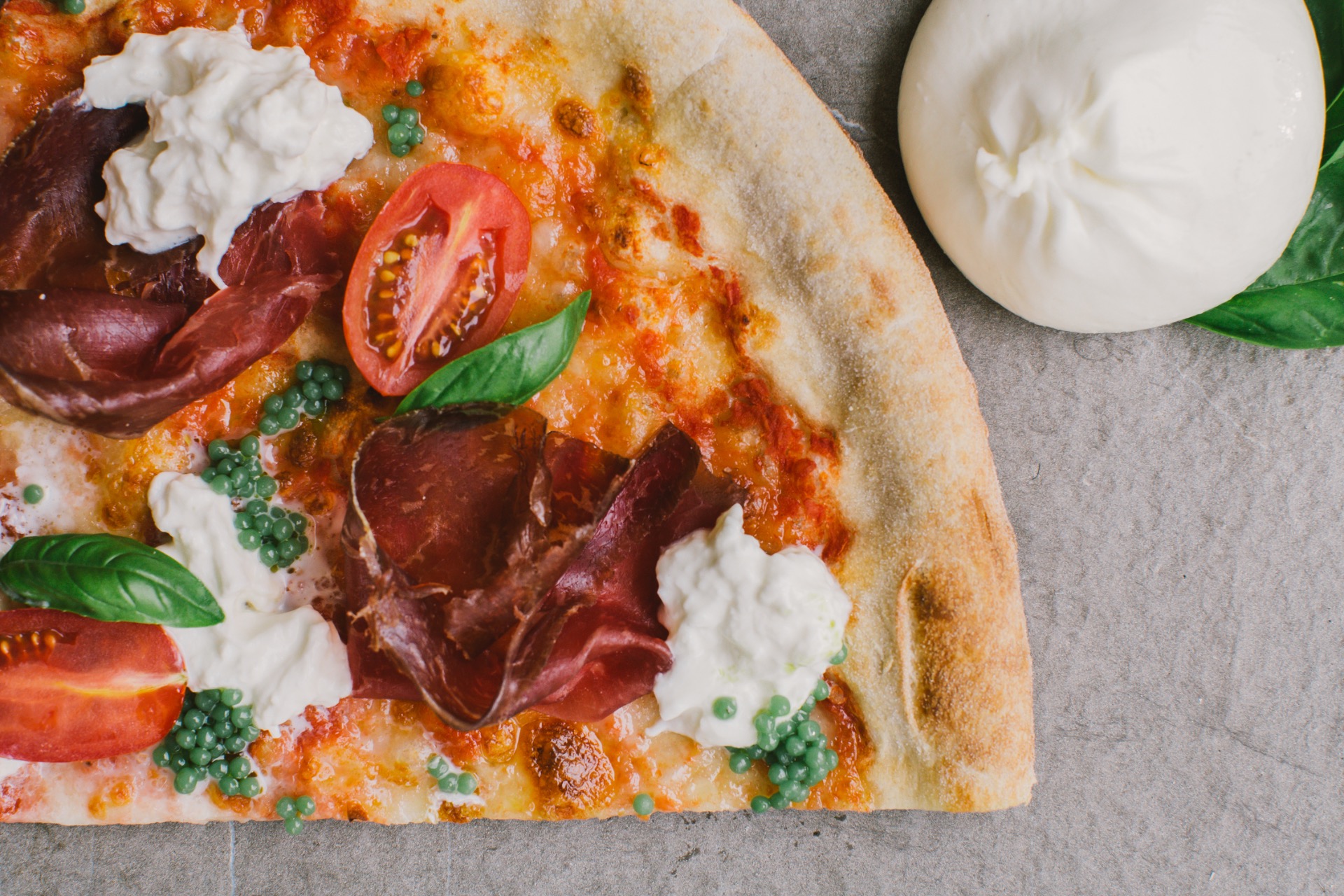 Salsa di pomodoro 100% italiano, mozzarella, Cecina de León, pom. datterini, cuor di burrata, perlage e polvere di pesto. BIRRA CONSIGLIATA: NOSTRANA o BIOCOLA Levico